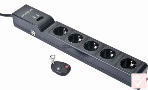 Hálózati elosztós hosszabbító, fekete, 5 aljzat, 2x USB, távirányítós, 1.8m