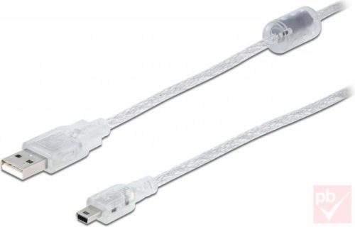 USB 2.0 A-mini B összekötő kábel 0.5m átlátszó, zavarszűrő ferritgyűrűvel